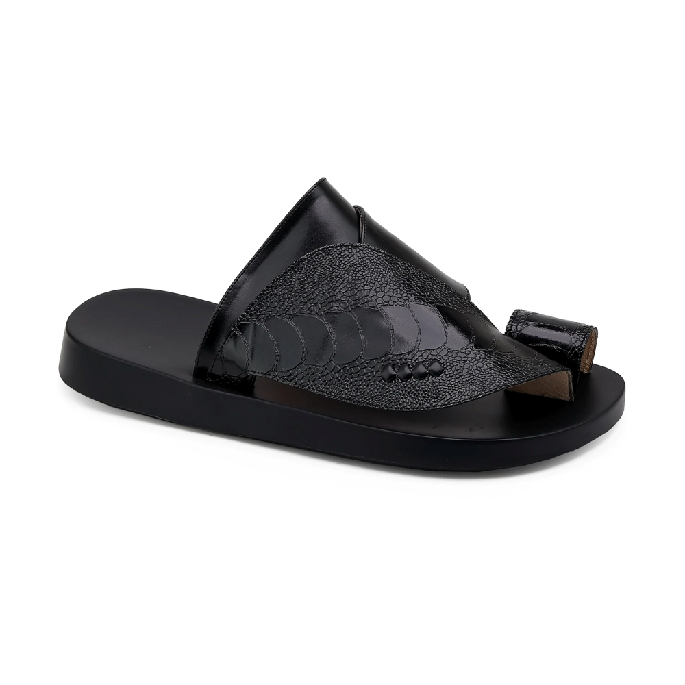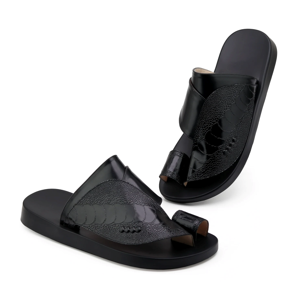 حذاء شرقي فاخر مصنوع من جلد ساق النعام الأسود، يجمع بين الفخامة والتميز بتصميم شرقي كلاسيكي يعكس الذوق الرفيع. يتميز بملمس فاخر وتفاصيل أنيقة توفر لك الراحة والمتانة، مما يجعله خيارًا مثاليًا للمناسبات الرسمية والإطلالات اليومية الراقية