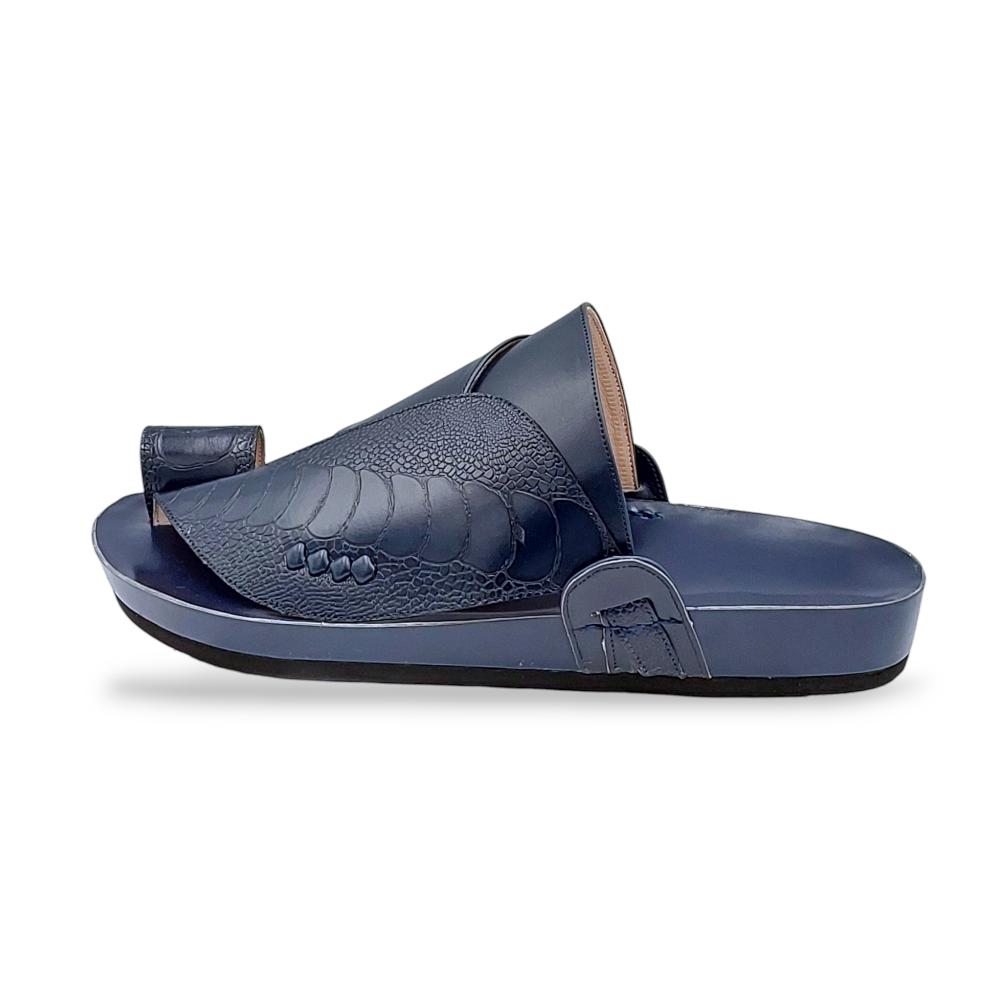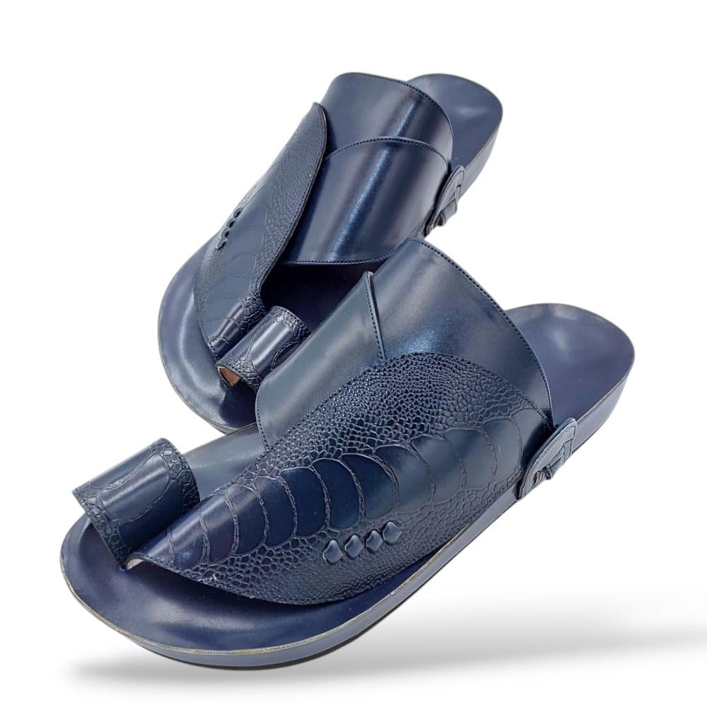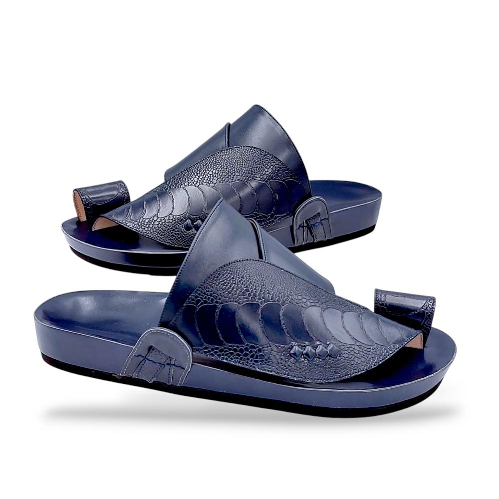 "حذاء شرقي محفور مصنوع من ساق النعام الفاخر باللون الكحلي، يجمع بين الأصالة والفخامة في تصميم استثنائي. يتميز بنقوش طبيعية من جلد ساق النعام تمنحه مظهراً فريداً وأنيقاً، مع تفاصيل محفورة تضيف لمسة من التميز. صُنع بحرفية عالية ليضمن لك راحة مثالية ومتانة تدوم طويلاً. اختيار مثالي للرجل الأنيق الذي يبحث عن الفخامة والتميز في كل مناسبة."