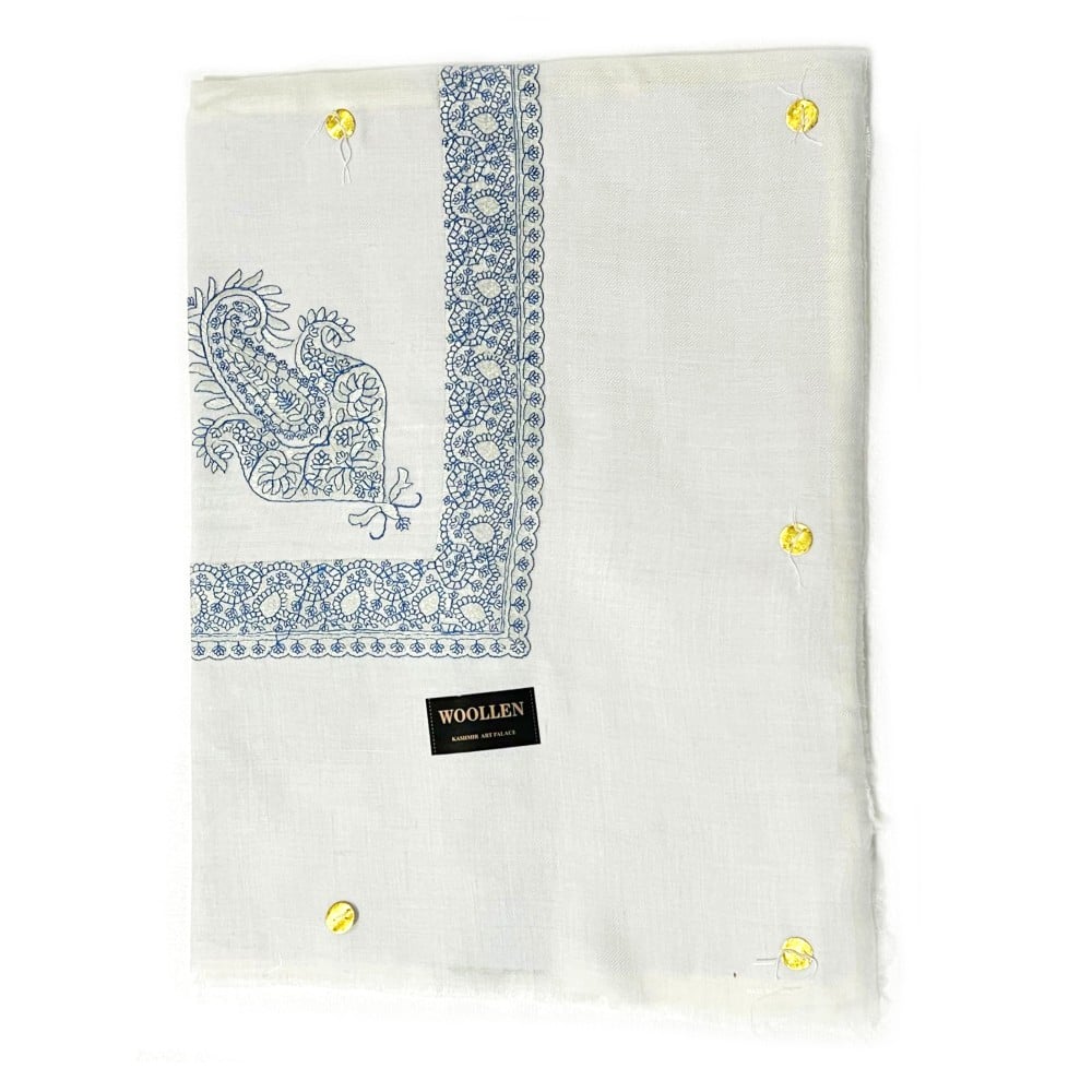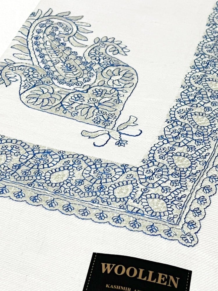 شال صوف كشميري نقش أزرق وخلفية بيضاء